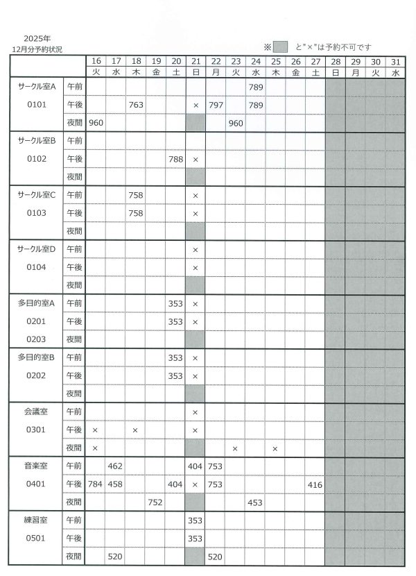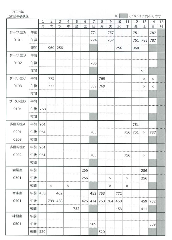 〇この表は事前予約のための表です。通常の予約については反映されませんのでご注意ください。