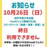 - 10月14日(月・祝) Youthフェス ステージ出演タイムスケジュール発表!いよいよ、待ちに待った『Youthフェス』まであとわずか! ついに、ステージ出演のタイムスケジュールを公開しました! 中学生から大学生まで、神戸のさまざまな若者が集まってパフォーマンスを披露してくれます! ステージの他に […]