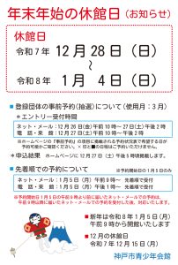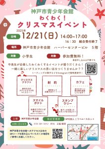 神戸市青少年会館では、今年も中高生が企画・運営するクリスマスイベントを開催いたします!! 小学生の皆さんが楽しめるよう、工夫を凝らしたブースを多数ご用意しております。 事前申し込みは不要です。 お気軽にご参 […]